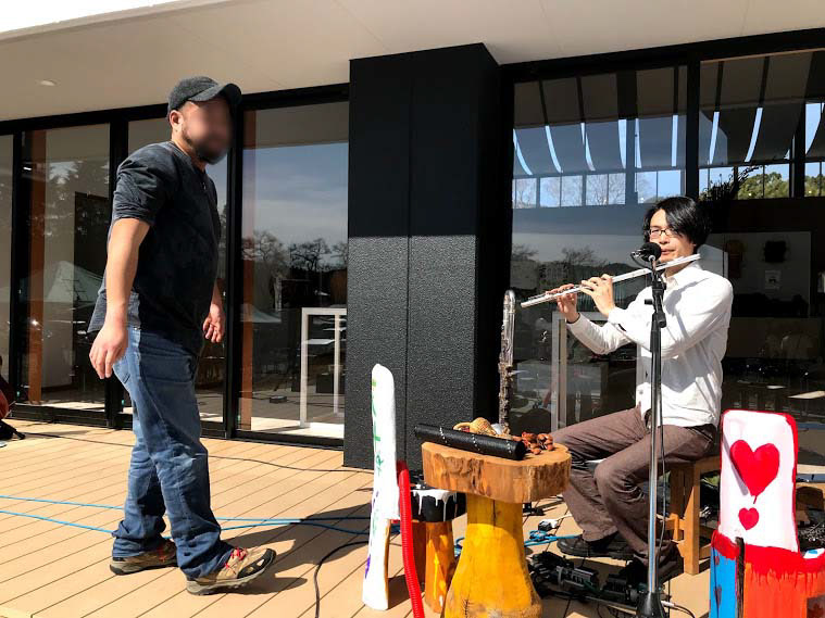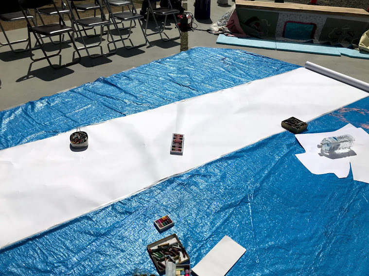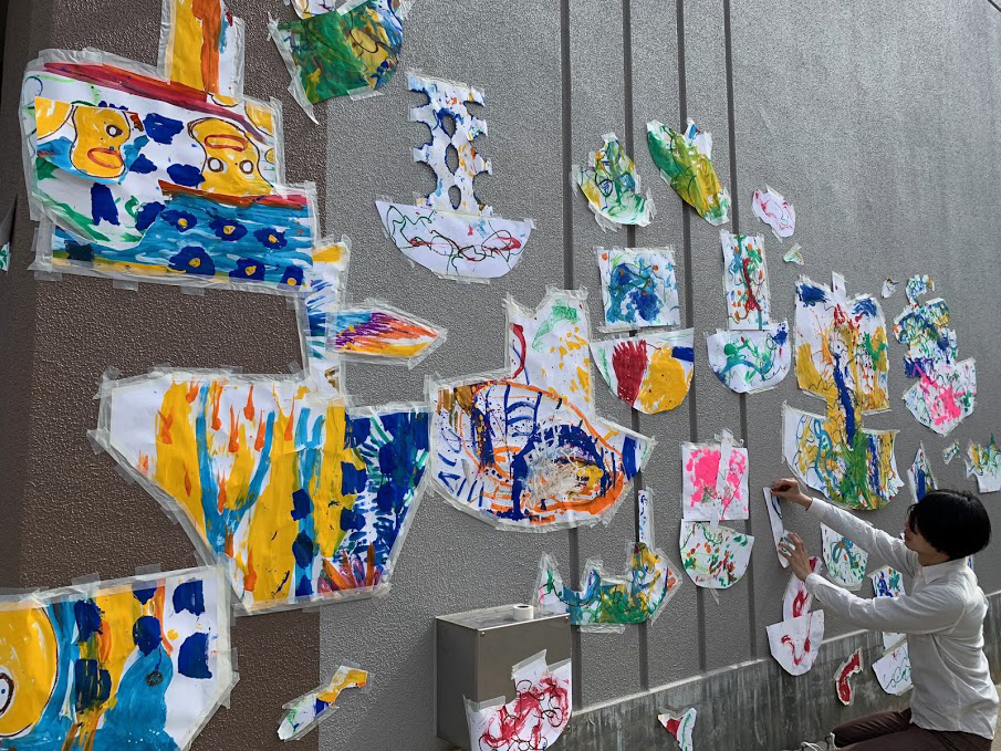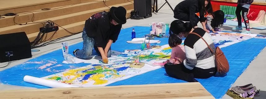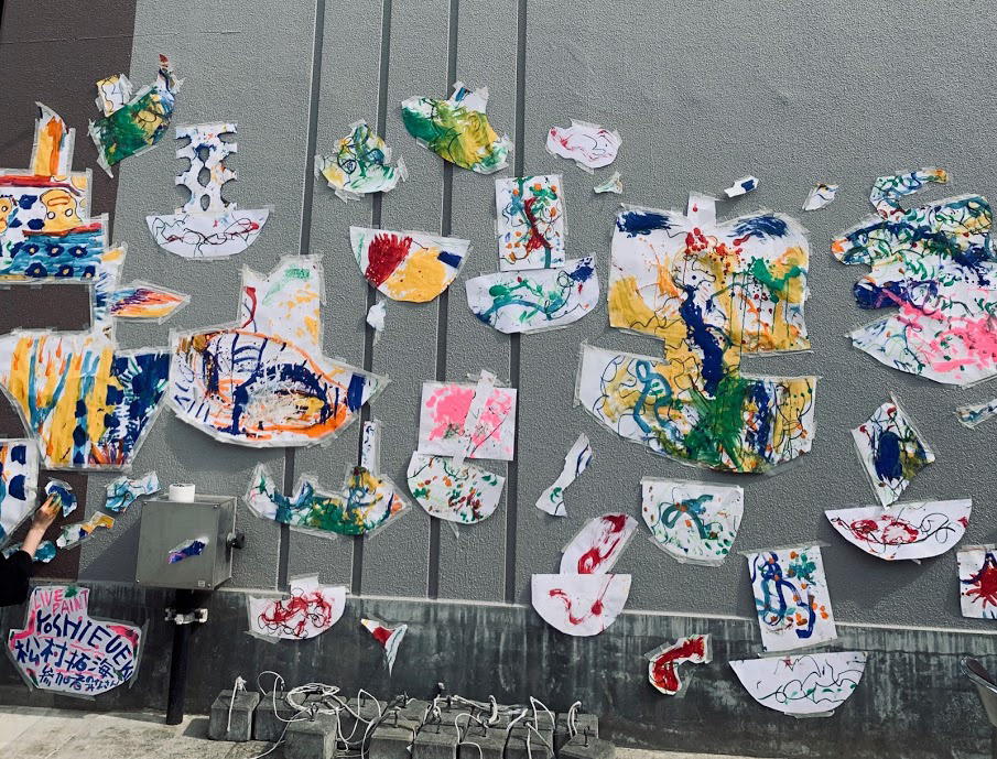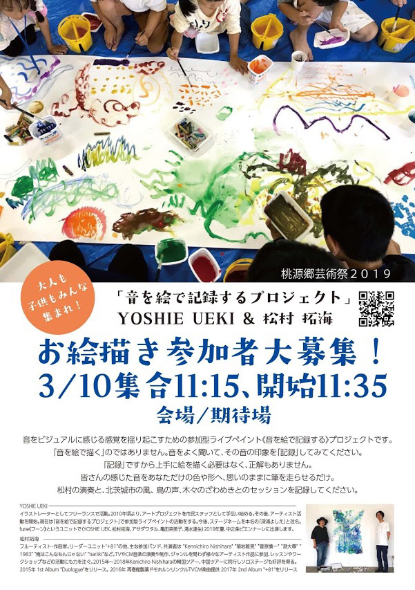 北茨城市の「桃源郷芸術祭」。松村拓海さんの作曲+即興で私と来場者でライブペイント。絵は壁にコラージュして展示。